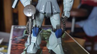 ドダイの制作記録!ゲルググとセット購入したものの、今回はドダイのみ制作。スミ入れ練習としてスジボリを活用し、ディスプレイを背景にして撮影にも工夫を加えました。