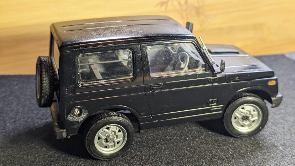 今回、私が挑戦した2つ目のプラモデルは、スズキ ジムニー(JA11-5型)です。選んだ理由はシンプルで、私自身が欲しい車だからです。自分がこの車に乗ることを想像しながら、ボディーの塗装を試してみたくなりました。